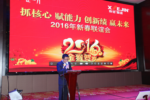 公司總經(jīng)理王少華在致辭中表示,2016年是關(guān)系企業(yè)生存的關(guān)鍵一年,希望全體協(xié)進(jìn)人和經(jīng)銷商能夠更進(jìn)一步發(fā)揚(yáng)“攜手創(chuàng)輝煌,創(chuàng)新求卓越”的協(xié)進(jìn)精神,精誠團(tuán)結(jié)、齊心協(xié)力,確保企業(yè)渡過這一艱難時(shí)期。在這期間,一是牢牢抓住產(chǎn)品創(chuàng)新這個(gè)核心。通過加快對(duì)新產(chǎn)品的研發(fā)投入,促進(jìn)產(chǎn)品升級(jí)升值。比如公司最新研發(fā)的漢文化磚系列和小規(guī)格仿古磚系列新產(chǎn)品,就是為企業(yè)穩(wěn)健發(fā)展創(chuàng)造新的增長動(dòng)力。二是賦予能力。通過持續(xù)的學(xué)習(xí)培訓(xùn),進(jìn)一步提高全體人員的經(jīng)營管理能力、勞動(dòng)技能水平和營銷業(yè)務(wù)技能。三是創(chuàng)新營銷模式。借用互聯(lián)網(wǎng)思維,開創(chuàng)新一代的營銷模式。2016年公司對(duì)營銷體制進(jìn)行改革,讓更多有能力的員工在企業(yè)平臺(tái)上打拼一番新的事業(yè)。四是精細(xì)化生產(chǎn)管理。通過流程再造,有效控制成本,同時(shí)提高產(chǎn)品質(zhì)量。
